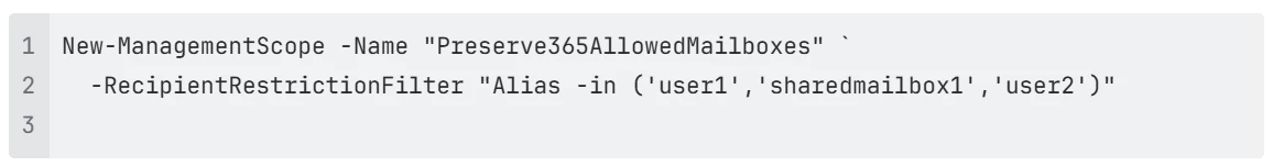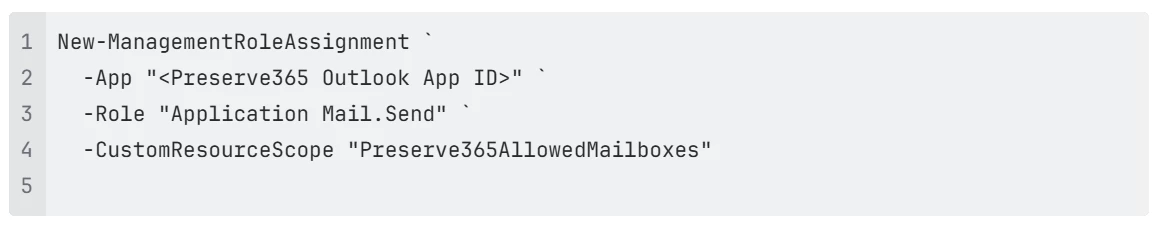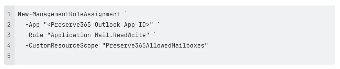 Assign the required application roles (permissions) to the Preserve365 service principal, scoped to the mailboxes defined above.