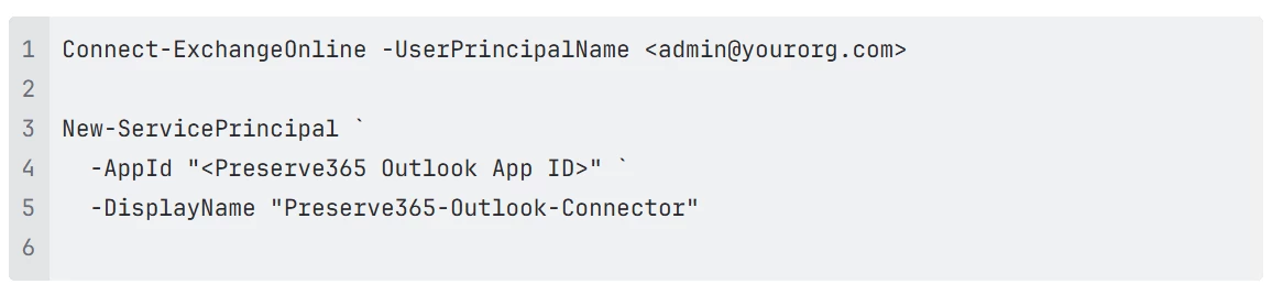 Connect to Exchange Online PowerShell and create a service principal that represents the app in Exchange Online: