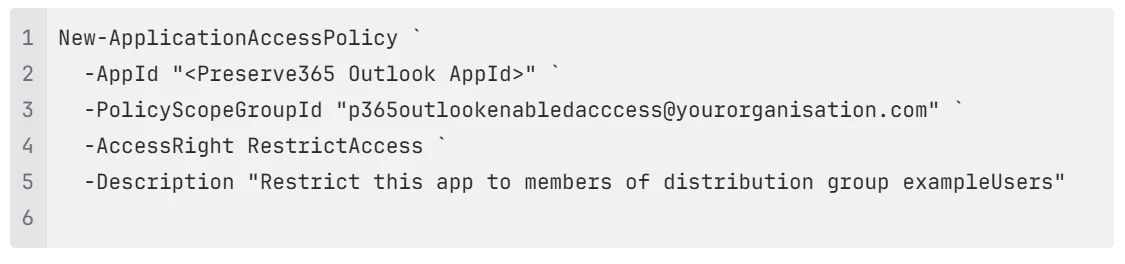 Once created, this policy ensures that the Preserve365 Outlook connector can only access the mailboxes listed in your Entra ID security group.