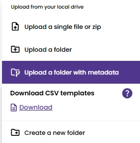 In the NewGen interface under the Add menu (below) there is an option to upload a folder that contains content files and a single CSV file that contains metadata to be applied to that content.
